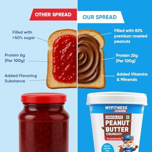 - SWITCH TO A HEALTHIER CHOCOLATE SPREAD: MyFitness Junior is thoughtfully made with 83% high-quality roasted peanuts and enriched with calcium, essential vitamins, and minerals, delivering an ideal blend of nutrition and delicious flavor. Unlike typical chocolate spreads, it provides your children with vital nutrients while still indulging their cravings for something sweet.