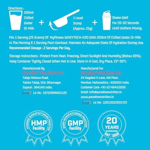 MYFITNESS is a registered trademark owned by Paradise Nutrition Inc. This advanced hypertrophy whey protein blend delivers 35g of protein, 3g of creatine monohydrate, 1000mg of citrulline, and 500mg of tribulus per serving, along with added digestive enzymes for enhanced absorption. To use, mix one scoop (25 grams) of MYFITNESS WHEYTECH-H2O with 200ml of cold water or milk, consuming one serving in the morning and another post-workout. Ensure you stay well-hydrated while using this product. The recommended intake is two servings daily. The whey protein concentrate and isolate are sourced from Europe and produced under ISO 22000 or HACCP-certified quality systems. The product is Halal and Kosher compliant, and is manufactured in India using a blend of carefully selected imported and local ingredients.