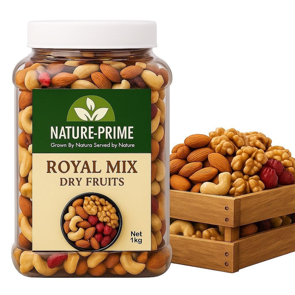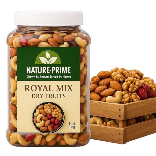 Nature Prime 100% Natural Premium Mix Dry Fruits 1kg with Almonds | Cashew | Kishmish | Apricot | Black Raisins | Dried Kiwi | Nuts and Dry Fruits 1 Kg (Jar pack) Nature Prime Royal Dry Fruit Mix | Premium Nuts & Dried Fruits Blend | Almonds, Cashews, Raisins, Pistachios, Walnuts, Figs | No Added Sugar | 1 kg PET Jar – Fast Shipping to USA & Canada