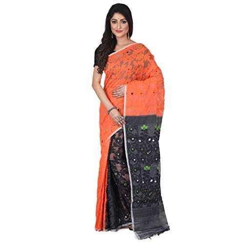 Nilu’s Collection Cotton-Silk Soft Dhakai Jamdani Handloom Saree with Full Body-Work for Women and Girls, Orange-Black – Fast Shipping to USA & Canada