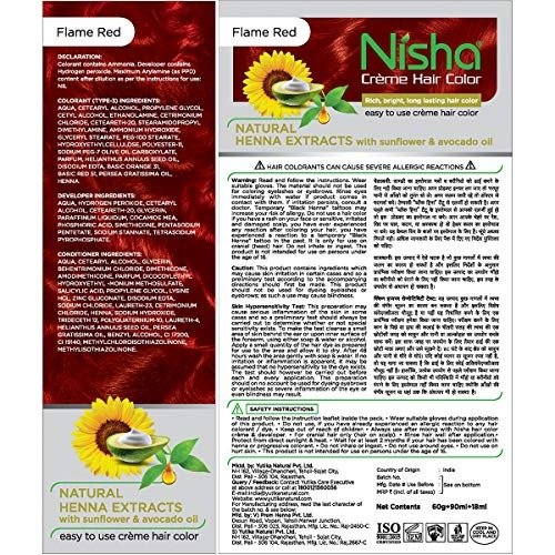• The package contains: one 60ml Nisha hair colorant along with a 90ml developer bottle, two 60g tubes of Nisha hair colorant (Flame Red and Burgundy), two 6ml conditioners, a pair of gloves, and a manual for home use available in five Indian languages.
