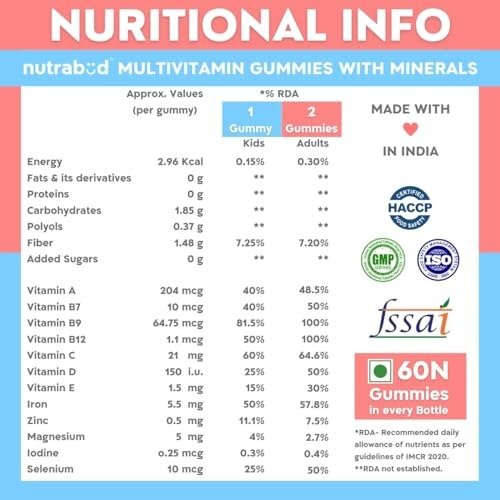 Introducing- Nutrabud Multivitamin Gummies for Kids, Teens & Adults. Each serving of multivitamin gummies for children includes the goodness of- Vitamin D, Vitamin B12 to support energy metabolism, Vitamin C & Zinc for immunity, Biotin & Vitamin E for healthy hair and skin, Vitamin A for sharp eyes, Folic acid, Iron, Magnesium for healthy growth. Nutrabud multivitamin and mineral gummies for kids are multifunctional, they contain all the nutrients parents want in a delicious format that kids love. Good health is at the center of everything we do. That’s why weve made it our mission to make nutrition easy to understand. Nutrition Backed Science Developed by leading scientists, our vitamin gummies are vegetarian and sugar-free enriched with vitamins, minerals & Prebiotic fiber, and designed to improve the quality of life of the entire family- Kids, parents alike. A to Z Ingredients Designed to leave your mind and body feeling invigorated and uplifted, our experts offer you products containing the active ingredient covering A-Z of health, scientifically proven to aid overall wellness, from vitamin A, C, E through to Zinc. Suitable For Everyone Nutrabud gummies are proudly vegetarian-friendly, non-GMO, cruelty-free, and gluten-free, and contain natural flavors making them suitable for everyone to consume. Yummy Gummy with 12 essential Multi-vitamin & minerals in Delicious mango flavor for children above 3 years Made with selected premium ingredients to boost immunity and overall development of your child’s growth