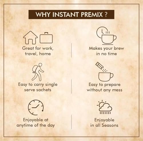 - INSTANT HOT MASALA CHAI AND COFFEE ON THE GO – ANYTIME, ANYWHERE: Savor these invigorating tea blends at any time of day or year. With its effortless preparation, this Instant Premix can be enjoyed anywhere?at home, in the office, or while traveling?without any hassle. All you need is a cup of hot water. The individual packaging enhances portability and simplifies preparation.