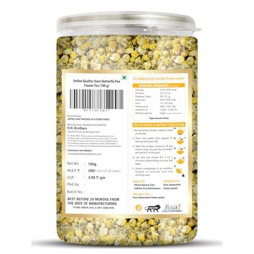 - Package Includes: 100g of Chamomile Flower Herbal Tea. The product has a shelf life of 24 months.