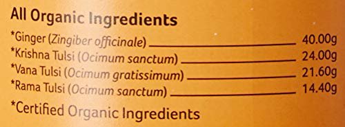 Ingredients: Rama Tulsi (Ocimum Sanctum), Krishna Tulsi (Ocimum Sanctum), Vana Tulsi (Ocimum Gratissimum), Ginger