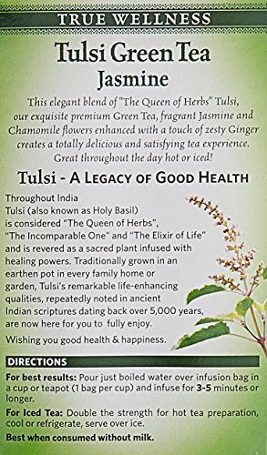 TULSI JASMINE GREEN TEA A fragrant blend of Tulsi, Jasmine & Green Tea 100% Certified Organic Give yourself a Tulsi Jasmine teatime treat! Sacred Tulsi leaves and sweet-scented Jasmine flowers, with green tea, chamomile and a touch of ginger, a flavorsome teatime treat that offers you pure satisfaction and a boost of energy with every cup!