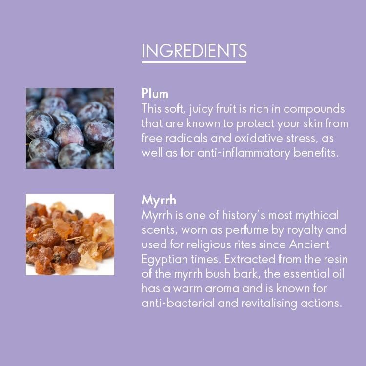 Enriched with natural essential oils celebrated for their smoothing and softening properties, this hydrating lotion is crafted to absorb swiftly, leaving behind a lingering, heavenly sweet aroma of plum and myrrh on your skin all day long. Elevate your moisturising routine with this lightweight, softening lotion, delicately scented with plum and myrrh and infused with pure essential oils. It absorbs effortlessly, leaving your skin feeling nourished, hydrated, and velvety soft.