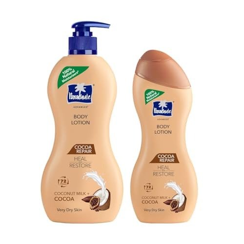 Achieve naturally radiant and luminous skin with the Parachute Advansed body lotion collection, designed for both women and men. This unique, patented formula is specifically tailored for Indian skin types. Infused with the nourishing properties of Pure Coconut Milk and Cocoa Butter, this lotion provides deep hydration, even in the harshest winter conditions. Our exclusive formulation, rich in coconut milk and cocoa butter, intensely moisturizes, nourishes, and safeguards your skin. It is meticulously designed to offer long-lasting hydration and repair dry skin, even in severe cold. This product is composed of 100% natural moisturizers and, unlike many other lotions, is free from mineral oils and petroleum-based ingredients (such as petroleum jelly or liquid paraffin). The Parachute Advansed Cocoa Repair Body Lotion is safe for your skin and does not contain silicones, sulfates, phthalates, or artificial colors. Perfect for extremely dry or very dry skin, it is suitable for both men and women. Use it regularly to enjoy deeply nourished and well-moisturized skin.