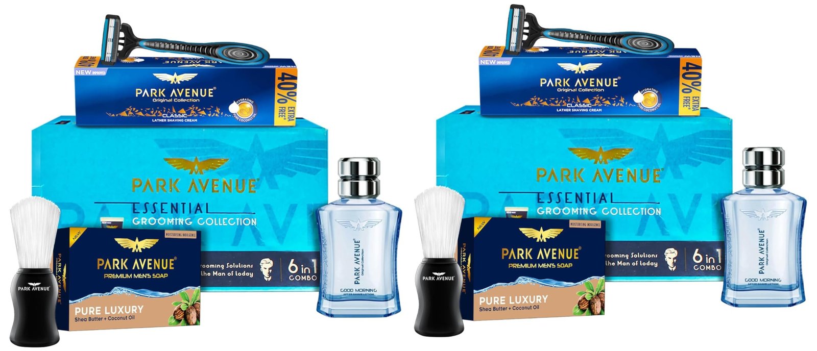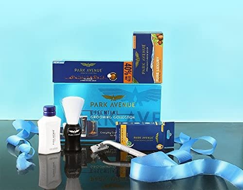 - Items: Park Avenue Good Morning Deodorant (40ml), Park Avenue Aftershave Lotion (50ml), Park Avenue Scented Soap (125g), Park Avenue Lathering Shaving Cream (84g), Park Avenue Shaving Brush (1 unit), Park Avenue Razor (1 unit)