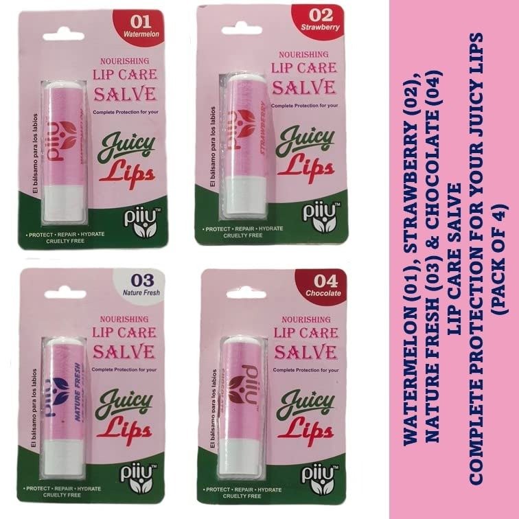 Piiu Nourishing Lip Care Salve, Complete Protection For Your Juicy Lips | Watermelon (01), Strawberry (02), Nature Fresh (03) & Chocolate (04) Lip Balm| Net Wt. 4.5gm | (Combo Pack) – Fast Shipping to USA & Canada