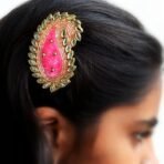 - A stunning, handcrafted hair accessory designed for girls, teens, and children. Featuring intricate embroidery and adorned with kundan stones and zardozi (gold wire) work, each piece is crafted on premium velvet, making it truly unique. Showcasing a traditional paisley motif, these accessories are vibrant ethnic statement pieces available in essential colors. They offer a distinctive alternative to typical hair bows, floral clips, or beaded pins you may have seen. Perfect for festive occasions or ethnic celebrations.