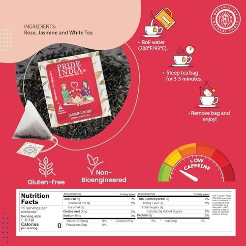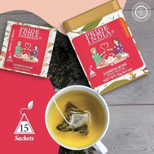 Pride of India | Jasmine Rose Royal White Tea | 15 Pyramid Full Leaf Individually Wrapped Tea Bags | Smooth & Sweet Flavor | Soothing & Calming Experience | Less Caffeine, Non-Bioengineered – Fast Shipping to USA & Canada
