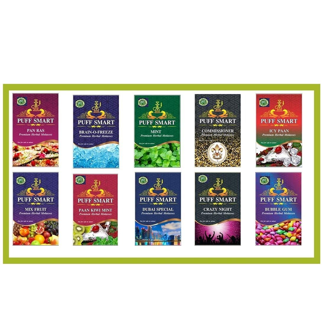 PUFF SMART Pan Ras, Mint, Brain-o-Freeze, ICY Pan, Mix Fruit, PKM, Dubai Special, Crazy Night and Bubblegum Herbal Hookah Molasses (Set of 10) (100% Tobacco and Nicotine Free) – Fast Shipping to USA & Canada