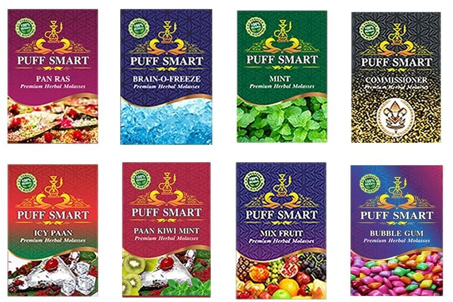 PUFF SMART Pan Ras, Mint, Brain-o-Freezer, ICY Pan, Mix Fruit, PKM, Comm. and Bubblegum Herbal Molasses (Set of 8) (100% Tobacco and Nicotine Free) – Fast Shipping to USA & Canada