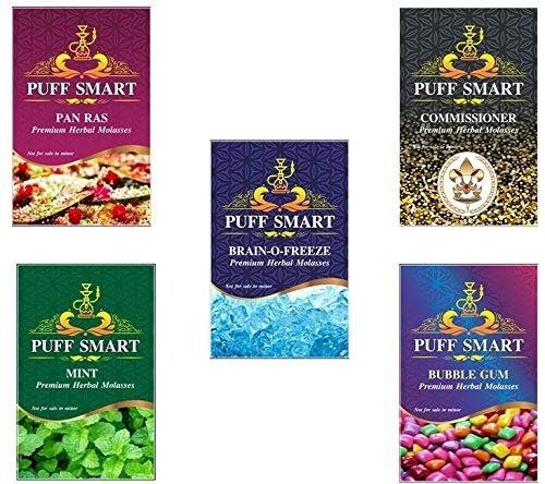 PUFF SMART Pan Ras, Mint, Commissioner, Brain-O-Freezer and Bubblegum Herbal Molasses (Set of 5) (100% Tobacco and Nicotine Free) – Fast Shipping to USA & Canada