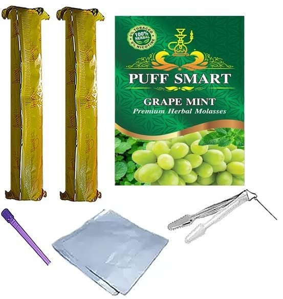 PUFF SMART Premium Herbal Flavors Grape Mint, Tong, 2pcs foil, 1Mt And 2 Polo Quick Light Charcoal Combo (100% Tobacco and Nicotine Free – Fast Shipping to USA & Canada