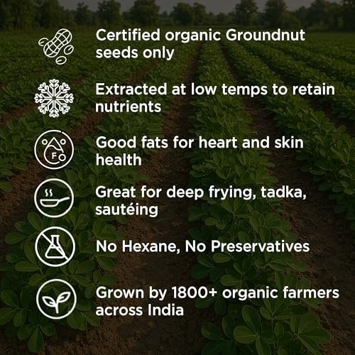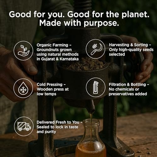 - 100% Organic & Cold Pressed: Our oil is made from premium, certified organic groundnuts grown in the fertile soils of Gujarat and Karnataka. We use traditional cold-press methods at low temperatures to gently extract the oil, preserving its natural aroma, flavor, and nutrients. There?s no heat or chemical solvents involved-just pure, wholesome goodness.
