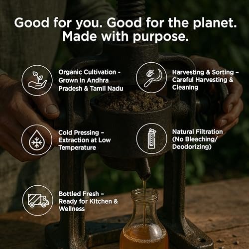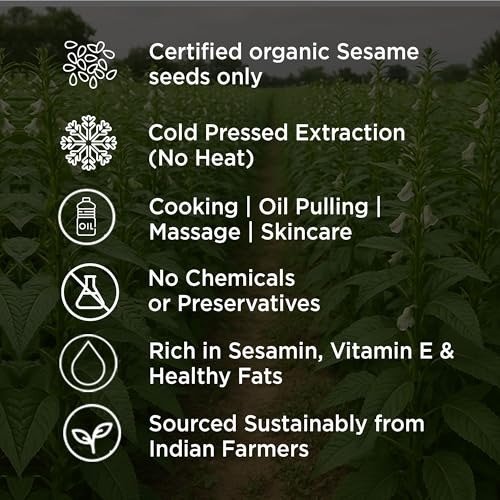 • 100% Organic & Cold Pressed for Pure, Authentic Flavor: Our sesame oil is made from handpicked, certified organic sesame seeds grown in the rich soils of Andhra Pradesh and Tamil Nadu-areas renowned for producing some of India?s best sesame. We use the traditional cold press (wooden ghani) method, gently extracting the oil at low temperatures. This careful process preserves the oil?s natural golden color, rich nutty aroma, and full nutritional value, without any heat or chemicals.