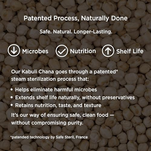 - Patented Steam Sterilization ? Safer and Naturally Fresh: Our Kabuli Chana is treated with a unique, patented steam sterilization process that reduces harmful microbes and keeps it fresher for longer-without the use of chemical preservatives. This gentle, natural method preserves both the safety and nutritional value of the chana, so you can enjoy pure, wholesome goodness in every bite.