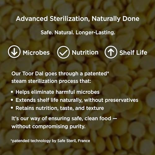 • Patented Steam Sterilization ? Clean, Safe, and Fresh Nutrition: What makes our Toor Dal unique is our exclusive steam sterilization process-a patented method that uses only pure steam to gently remove harmful microbes, with absolutely no chemicals involved. This not only makes our dal safer to eat, but also helps it stay fresh for longer, all while preserving its natural taste and nutritional goodness. It?s a modern, natural approach to food safety that very few brands in this category can match.