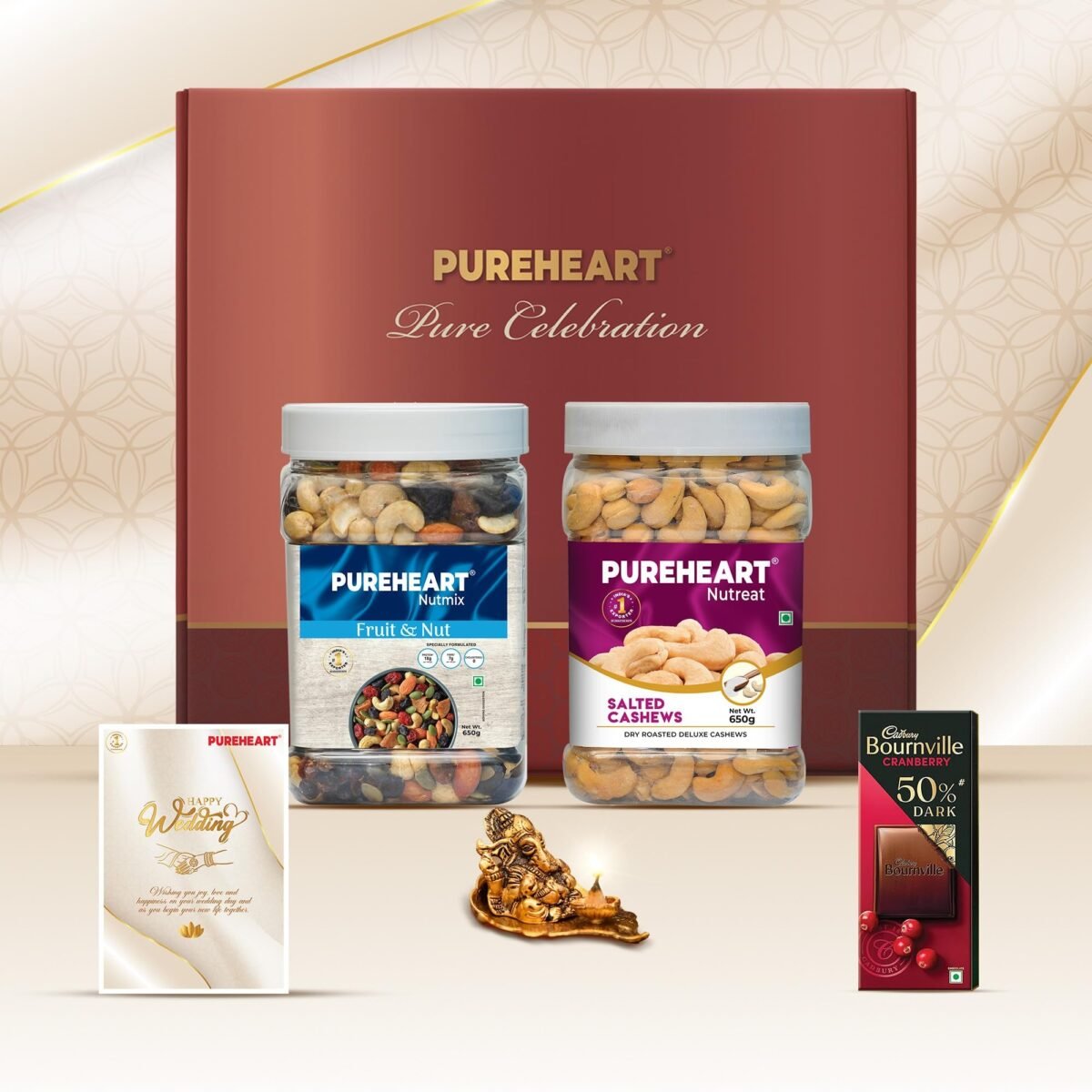 PUREHEART Pure Celebration Premium Wedding Gift Box | Dry Fruits Gift Hamper For Couples | Fruit & Nut Nutmix, Salted Cashews (650g, each) | Bournville Chocolate & Wishing Card | Ganpati Diya – Fast Shipping to USA & Canada