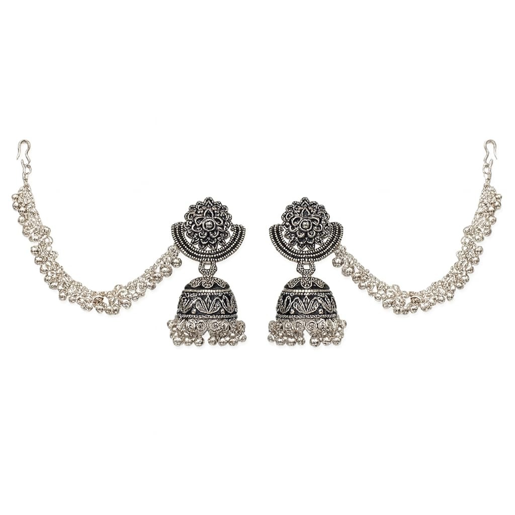 - Timeless Oxidised Silver Jhumkas ? Sophisticated jhumka earrings featuring an attached hair chain, expertly crafted from high-quality brass and adorned with an oxidised silver finish.