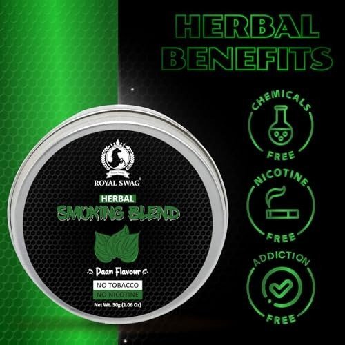 Royal Swag Mixture is a completely natural, ayurvedic smoking blend crafted from a variety of herbal ingredients. This herbal mixture is entirely free from tobacco and nicotine, offering a healthier alternative for those seeking a tobacco-free experience. Made exclusively from natural components, it delivers a pleasant taste thanks to a blend of herbs such as clove, tulsi (holy basil), cinnamon, mulethi (licorice), green tea, and ajwain, all enhanced with natural flavors. The blend contains no harmful substances or artificial additives. Each container holds 30 grams of the herbal mixture, packaged for convenient and secure storage and use.