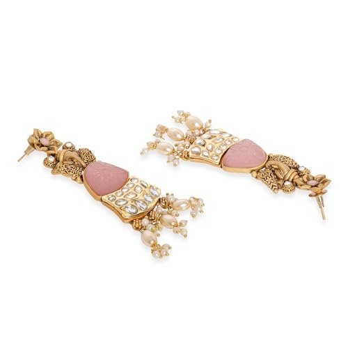 • Ganesh Motif Design in Divine Elegance: These earrings, adorned with 18K gold plating, showcase an intricate Ganesh motif, adding a spiritual essence that beautifully merges tradition with artistry.