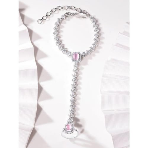 This stunning rhodium-coated ring bracelet showcases a captivating pink AD stone complemented by white cubic zirconia embellishments. Its refined design effortlessly merges a ring and a bracelet, resulting in a chic statement accessory that enhances the allure of any ensemble.