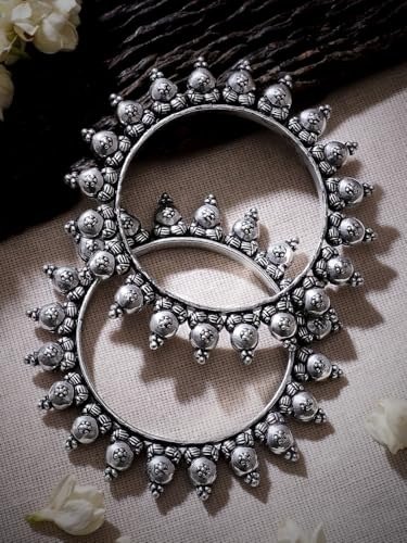Distinctive Artisan Craftsmanship: Each bangle is meticulously handcrafted by skilled artisans, resulting in subtle variations that lend a unique character to every piece. This craftsmanship infuses the jewelry with a special narrative and charm. Timeless Vintage Appeal: The oxidized silver plating imparts an antique allure, featuring a darkened finish that enhances its depth and intricacy, setting it apart from standard silver. Enhanced Style: Offered as a duo, these bangles enable you to achieve a layered aesthetic that adds dimension and individuality. Alternatively, they can be worn separately for a more understated vintage vibe. Featherlight Comfort: Typically, oxidized silver is lightweight, ensuring that you can enjoy comfortable wear throughout the day or evening, regardless of how you choose to style them. Ideal Gift & Engaging Topic: With their distinctive artisan details, vintage-inspired design, and oxidized finish, this bangle set makes a considerate gift and is bound to spark conversations. They are perfect for birthdays, holidays, or simply for someone who appreciates unique jewelry.