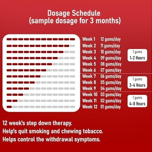 • Smoking cessation aids designed for individuals who light up their first cigarette over 30 minutes after waking. This mint-flavored nicotine gum assists in managing nicotine consumption and easing cravings for cigarettes. For the initial six weeks of a 12-week quitting plan, chew one piece every one to two hours to support your commitment to quitting.