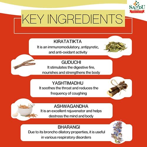 - Ingredients: Neem (Azadirachta indica), Kiratatikta (Swertia chirata), Guduchi (Tinospora cordifolia), Parpat (Fumaria parviflora), Bharangi (Clerodendrum serratum).