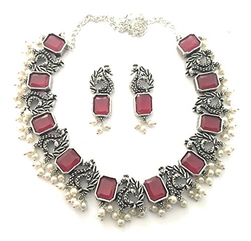 - Elegant Oxidized Peacock Choker Set: This necklace set features a stunning oxidized German silver design with a rectangular stone and peacock motif, perfect for elevating your classic attire. Its intricate craftsmanship and silver finish ensure it remains a timeless piece, making it a treasured addition to any jewelry collection.