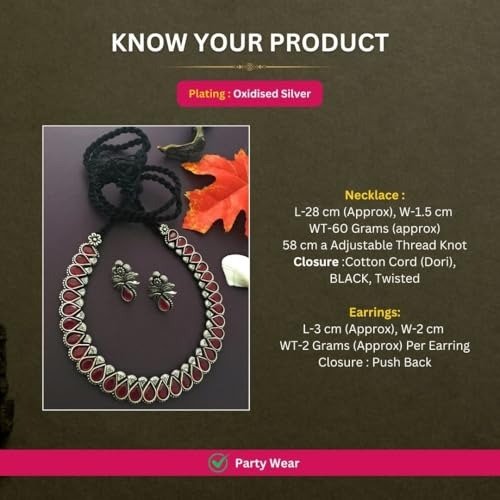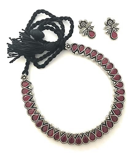 • Product Description This stunning oxidized silver necklace set showcases teardrop shaped pendants elegantly encased in intricately engraved frames. Accompanied by matching earrings it serves as a refined and cohesive enhancement to your jewelry collection. The adjustable black thread provides both comfort and adaptability for various neck sizes. Ideal for festivals parties or cultural events this set beautifully blends traditional allure with a modern flair.
