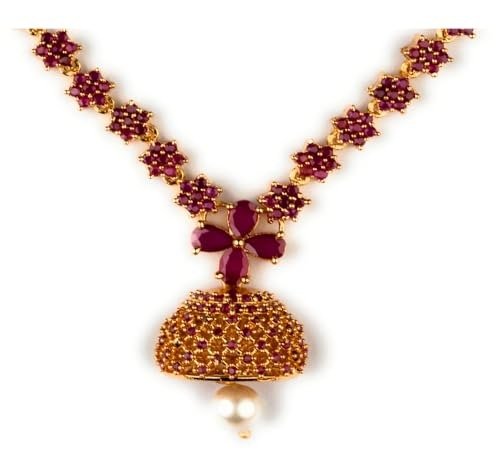 - Detailed Bell Jhumka Creation This exquisite micro gold-plated jewelry ensemble showcases a captivating bell pendant embellished with AD stones paired with coordinating jhumka earrings. The necklace features a versatile chain adorned with elaborate floral motifs while both the pendant and earrings exhibit a charming bell silhouette infusing a sense of traditional grace and refinement. Perfect for cultural weddings sarees and half sarees this collection from Sasitrends available on Amazon is an essential enhancement to your jewelry collection.