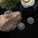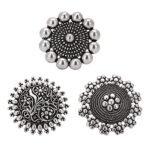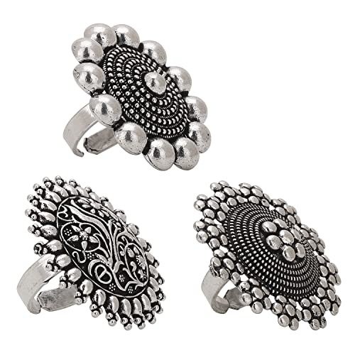 - Artistry and Craftsmanship Exquisite floral and circular designs featuring a classic oxidized silver finish highlighting meticulous craftsmanship. These adjustable rings available as a set of three are ideal for enhancing the elegance of any ensemble.