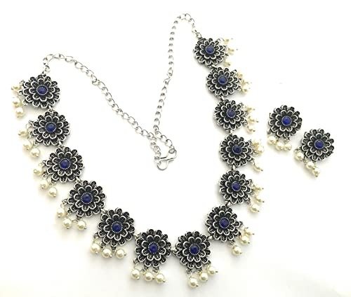 - Royal Floral Motif Oxidised Necklace Set Elevate your style with this exquisitely designed oxidised German silver necklace set showcasing a stunning floral motif. The layered jasmine flower effect paired with a brilliant round stone imparts a royal flair to your outfit. The graceful pearl drops further enhance its allure making it a perfect choice for lavish events. Made from premium alloy with an oxidised finish this set includes coordinating earrings effortlessly completing your look with elegance.