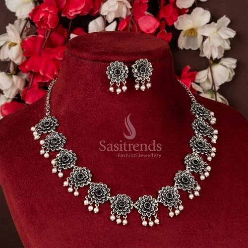 Sasitrends Oxidized Pearl German Silver Stone Studded Jewellery Necklace Set for Women and Girls – Fast Shipping to USA & Canada