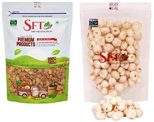 SFT Raisin with Seed (Munakka) Abjosh 1 Kg & Lotus Seed Pop / Gorgon Nut Puffed Kernels (Phool Makhana) Fox Nut Organic (Grade – Big Size) 500Gm – Fast Shipping to USA & Canada