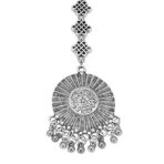 Designer oxidized silver self-design maang tikka, a beautiful head accessory.