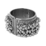 - Add a touch of elegance to any outfit with this stylish and trendy Jhumki Latkan cuff bangle bracelet. Perfect for all occasions and festivals, its German oxidized silver base gives it a stunning look that pairs beautifully with any traditional attire.