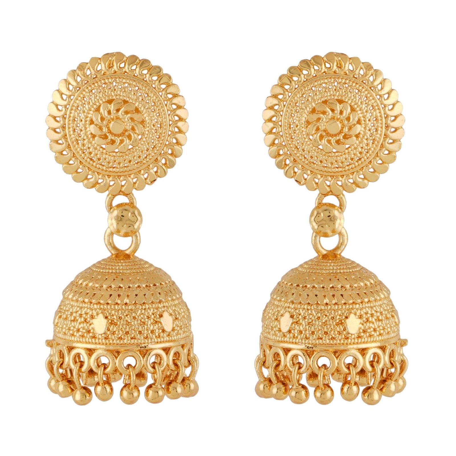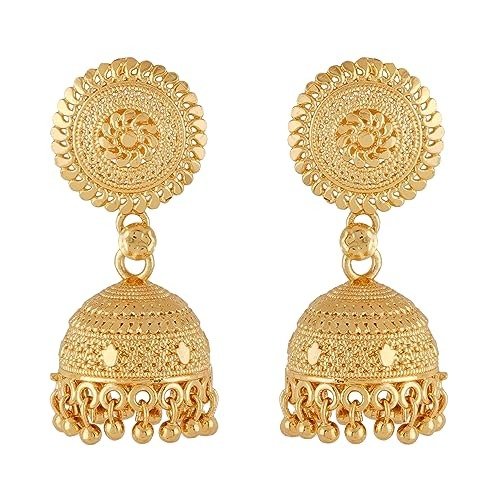 - These stunning jhumka earrings feature a beautiful floral self-design with intricate filigree work and a rich micron gold polish finish. Their bold, ethnic style makes them a perfect statement piece to complement any outfit-whether it?s your everyday office wear or something special for an occasion. Ideal for dinner parties, birthdays, weddings, festivals, graduations, concerts, or anniversaries, these earrings are designed to add a touch of elegance to every moment.