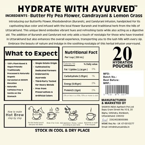 - MAGICAL HERBAL BLEND: Savor the captivating azure hue and subtle taste of our Butterfly Pea Tea Tisane, enhanced with Rhododendron (Buransh) and Gandyrani, harvested from the tranquil hills of Uttarakhand. This infusion provides a distinctive and invigorating flavor journey that captures the spirit of the Himalayas.