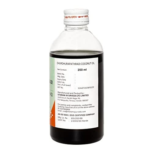 • Dhurdhoorapathradi Hair Oil (also known as Dhurdhurapatradi Keratailam or Durdurapatradi Coconut Oil) from Sitaram Ayurveda is a traditional Ayurvedic hair oil made with coconut oil and a blend of herbal ingredients. It’s specially formulated to help nourish the scalp, reduce dandruff, and promote healthy hair growth.