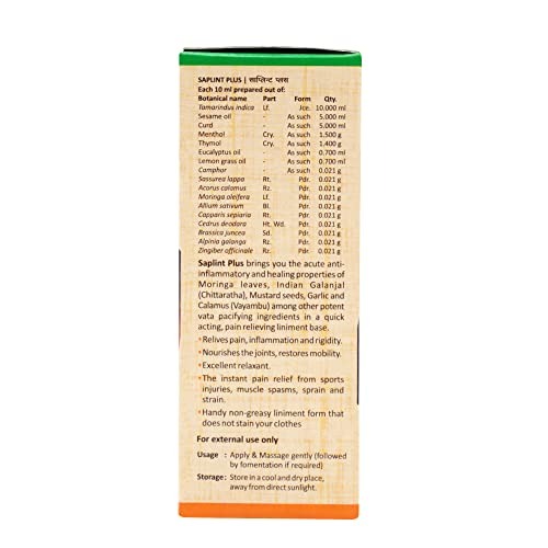 - Convenient for on-the-go use, Saplint Plus comes in an easy-to-apply liniment form. It?s non-greasy, won?t stain your clothes, and has a pleasant camphor (karpura) scent. It?s also an excellent relaxant.