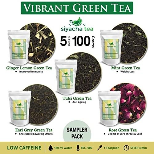 11 reviews for Siyacha Tea Vibrant Green Tea Sampler |5 Assorted Organic Green Tea -Variety Pack| Ginger Lemon, Mint, Earl Grey, Tulsi, Rose Chai I 20 Grams Each|100g – Fast Shipping to USA & Canada