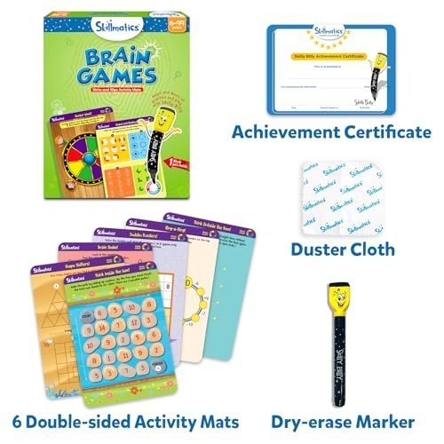 - WRITE AND WIPE ACTIVITY MATS: Comes with 6 reversible activity mats, a Skilly Billy marker, a cleaning cloth, and a Skilly Billy Achievement Certificate.