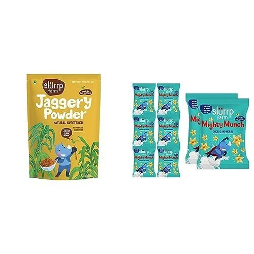 Slurrp Farm Natural Jaggery Powder 300G & Slurrp Farm Healthy Snacks for Kids Mighty Puff Cheese & Herbs 8X20g – Fast Shipping to USA & Canada
