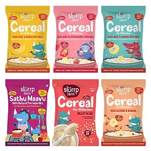 Discover the Slurrp Farm Multigrain Cereal Trial Pack – a convenient combo featuring Instant Ragi and Fruit Cereals (Strawberry, Mango, and Banana), as well as easy-to-prepare porridges like Ragi, Almond & Banana Cereal, Sathu Maavu, and Millet & Oats Porridge. Experience a variety of nourishing cereals crafted from ancient Indian grains, wholesome millets, nuts, and real fruit, designed to provide your child with a healthy and balanced start.