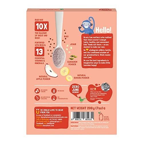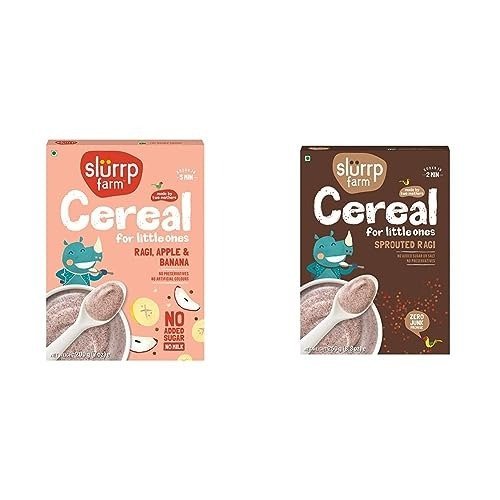 Introduce your child to their first solid foods with Slurrp Farm Cereal, packed with the wholesome benefits of ragi, jowar, cardamom, and real fruit such as apple and banana. Made with sprouted ragi, which contains 10 times more calcium than wheat or rice and is gentle on tiny tummies. Expand your baby?s palate with new flavors. Contains no added sugar, salt, refined flour (maida), milk, or artificial colors. These quick-to-prepare cereals are lovingly crafted by two mothers.